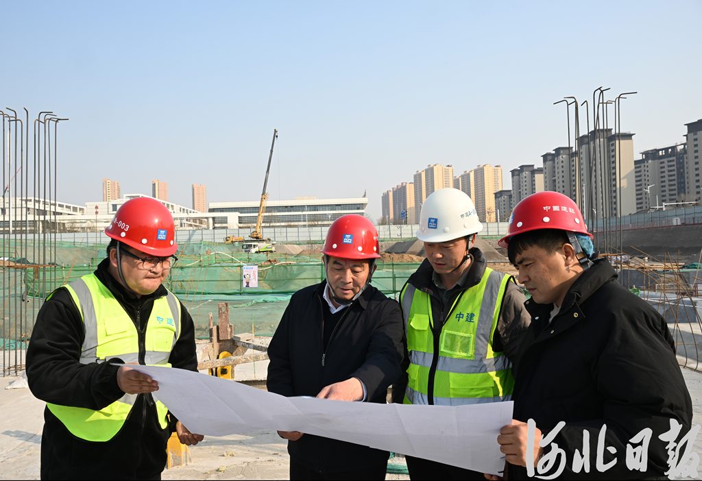 2月27日,正定縣塔元莊村黨委書記、村委會(huì)主任尹計(jì)平(左二)在康養(yǎng)項(xiàng)目建設(shè)工地,了解施工情況。河北日?qǐng)?bào)記者史晟全攝