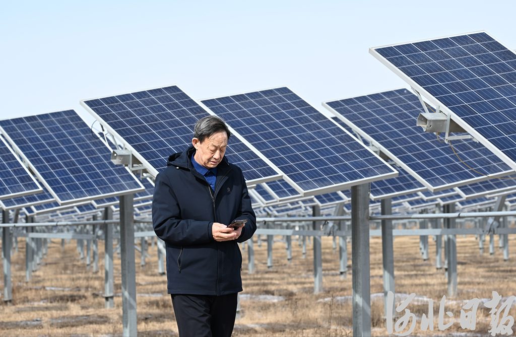 3月2日,張北縣小二臺(tái)鎮(zhèn)德勝村黨支部書記葉潤(rùn)兵通過手機(jī)查看光伏設(shè)備運(yùn)行情況。河北日?qǐng)?bào)記者耿輝攝