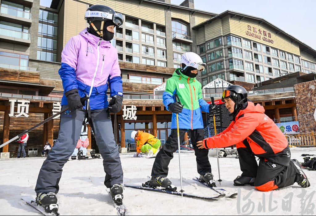 3月1日,崇禮區(qū)云頂滑雪場(chǎng)滑雪教練盧永帥(右一)在指導(dǎo)學(xué)員學(xué)習(xí)滑雪。河北日?qǐng)?bào)記者耿輝攝