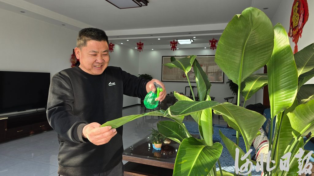 2月27日,涿州市刁窩鎮(zhèn)萬全莊村村民付繼軍正在新房里為花草噴水。河北日?qǐng)?bào)記者林鳳斌攝