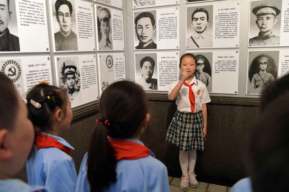 2021年5月12日,在井岡山革命烈士陵園,“小紅軍宣講團”的成員周煜菡給前來參觀研學的學生們進行義務講解。井岡山小學把“紅色德育”作為立德樹人的重要抓手,成立了“小紅軍宣講團”,培養(yǎng)了一批講好紅色故事、傳承先輩精神的小小義務講解員。