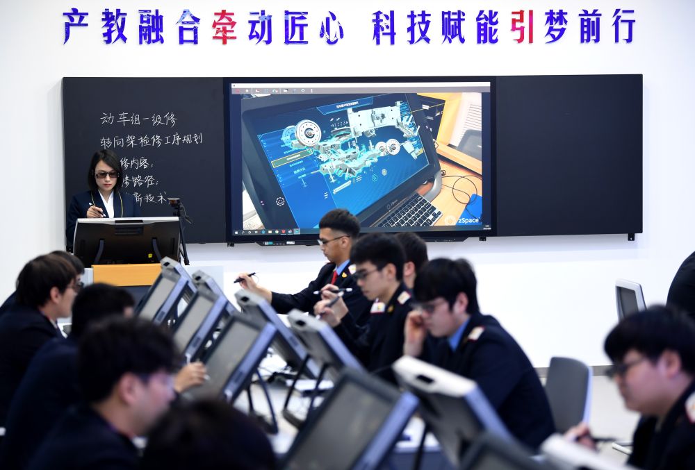 2022年4月29日,在西安鐵路職業(yè)技術學院,學生在動車組VR智慧課堂上模擬檢修。近年來,我國著力促進教育公平,提升教育質(zhì)量,加快推進教育現(xiàn)代化,教育數(shù)字化工作持續(xù)推進、成果豐碩。