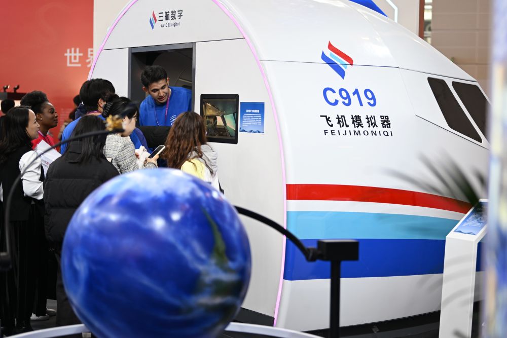 2024年11月21日,參會者在天津舉行的世界職業(yè)技術教育發(fā)展大會專題展上參觀C919飛機模擬器。展覽設置了技能塑造人生、技藝傳承文明、服務產(chǎn)業(yè)升級、國際交流合作、產(chǎn)教互融互通等7個板塊,全方位展示職業(yè)教育改革發(fā)展成果。