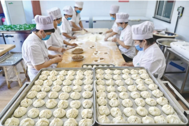 工人圍坐在寬長的木桌周圍包包子,一個個褶紋精致的包子整齊排列在托盤上。
