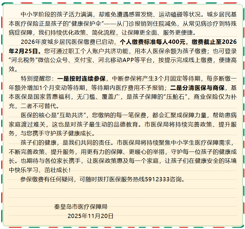 秦皇島市醫(yī)保局致全市中小學生家長的一封信