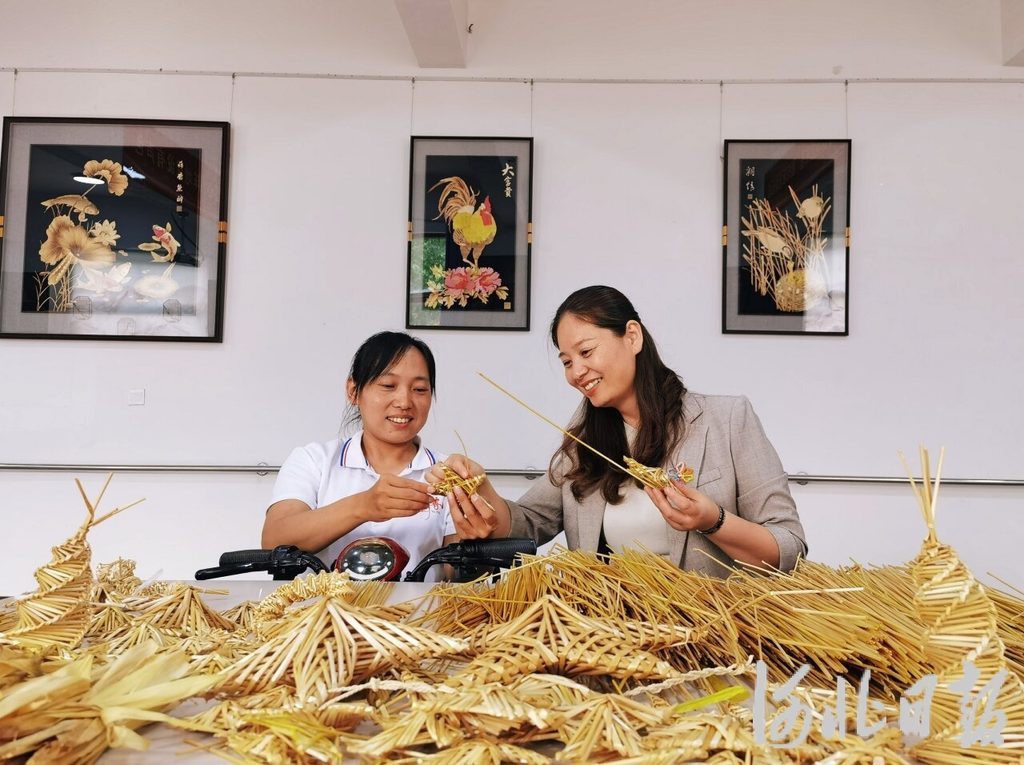 在邯鄲市大名縣禹善非物質(zhì)文化遺產(chǎn)殘疾人傳承教育中心,負責人谷穗(右)指導(dǎo)學員制作草編裝飾品。(河北日報資料片)河北日報記者盧旭東攝