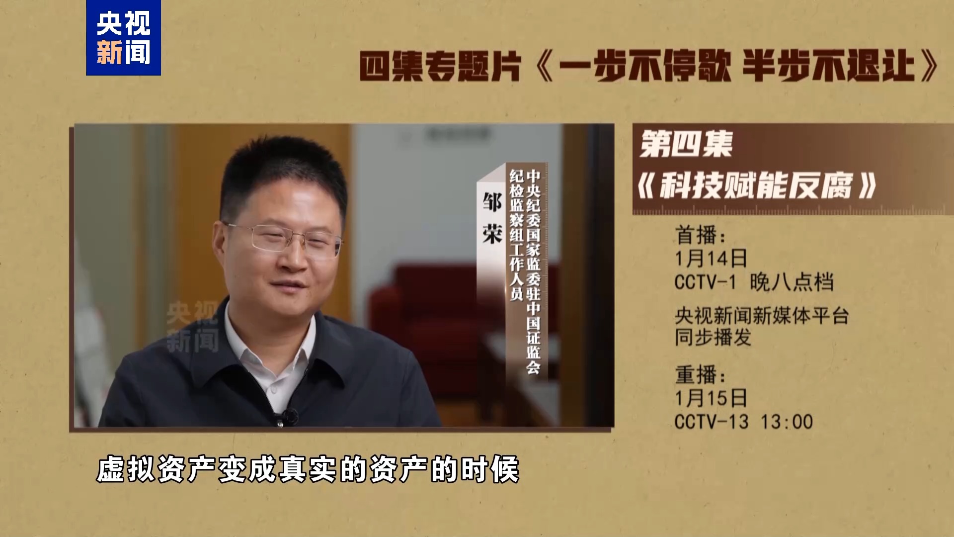 電視專題片《一步不停歇 半步不退讓》第四集《科技賦能反腐》,講述紀(jì)檢監(jiān)察機關(guān)豐富防治新型腐敗和隱性腐敗有效辦法,以信息化賦能正風(fēng)反腐,充分運用科技手段精準(zhǔn)發(fā)現(xiàn)不正之風(fēng)和腐敗問題線索、迅速有效突破案件,著力提升智慧反腐、科技反腐水平??偱_央視綜合頻道1月14日晚8點檔播出,央視新聞新媒體平臺同步播發(fā)。