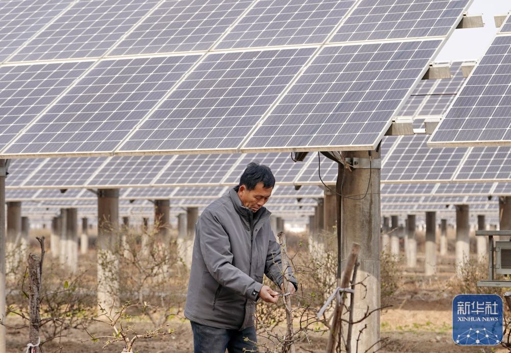 ↑ 1月16日,河北省巨鹿縣閻疃鎮(zhèn)的一名農(nóng)民在“農(nóng)光互補(bǔ)”光伏板下管護(hù)金銀花苗。
